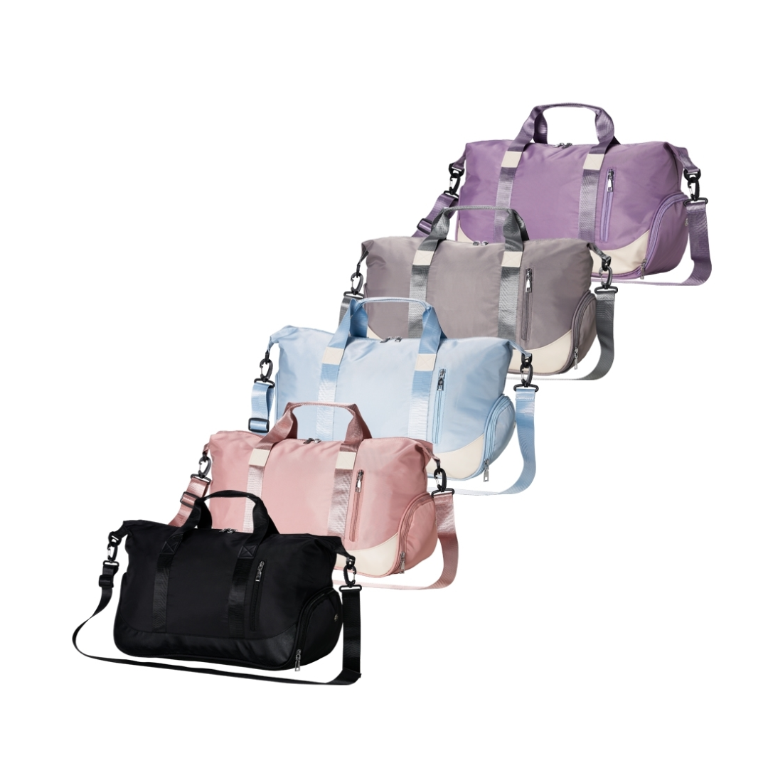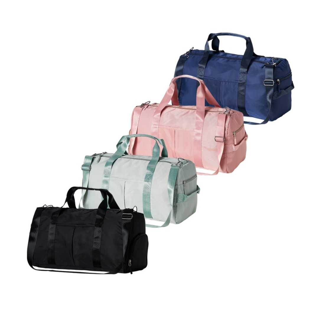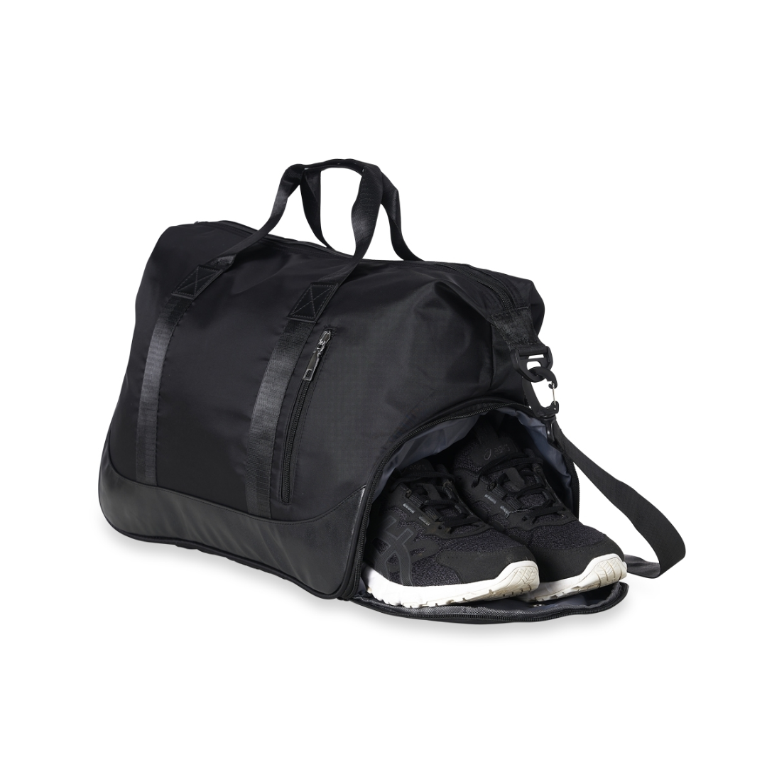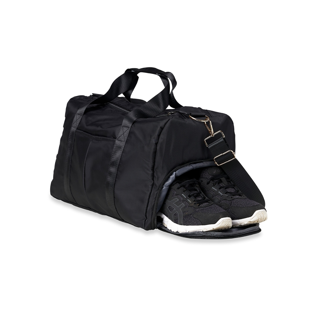 Bolsa esportiva de 35 litros em poliéster resistente à água com cinco compartimentos, sendo dois deles exclusivos para tênis e itens molhados. Contém bolso para encaixe em malas de viagem, bolso interno, alça de mão lateral extra e acompanha alça transversal. Medidas aproximadas: 28,8cm x 24,3cm x 50,8cm. Pedido mínimo: 50 unidades -