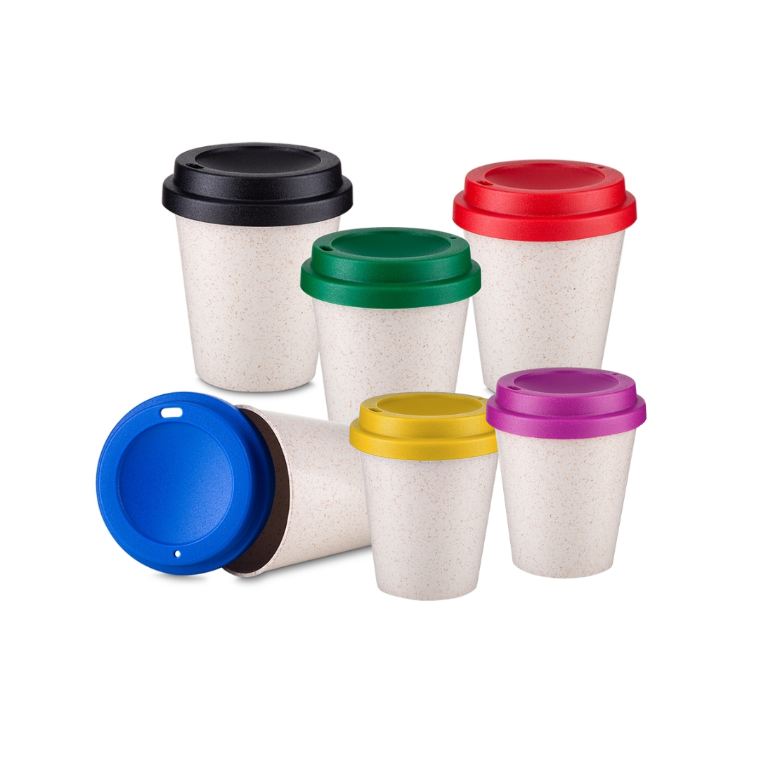 Copo fibra de arroz 350ml com tampa de bocal. Medidas aproximadas: 11cm x 9,3cm. Personalização: silkscreen. Pedido mínimo: 50 unidades. -