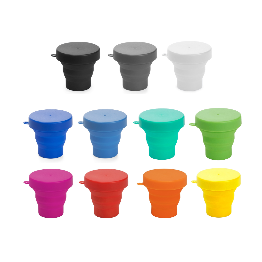 Copo retrátil com capacidade de 150ml, livre de BPA. Contém tampa plástica de encaixe com acesso para chaveiro. Medidas aproximadas: 7cm x 8,5cm. Personalização: silkscreen. Pedido mínimo: 50 unidades. -
