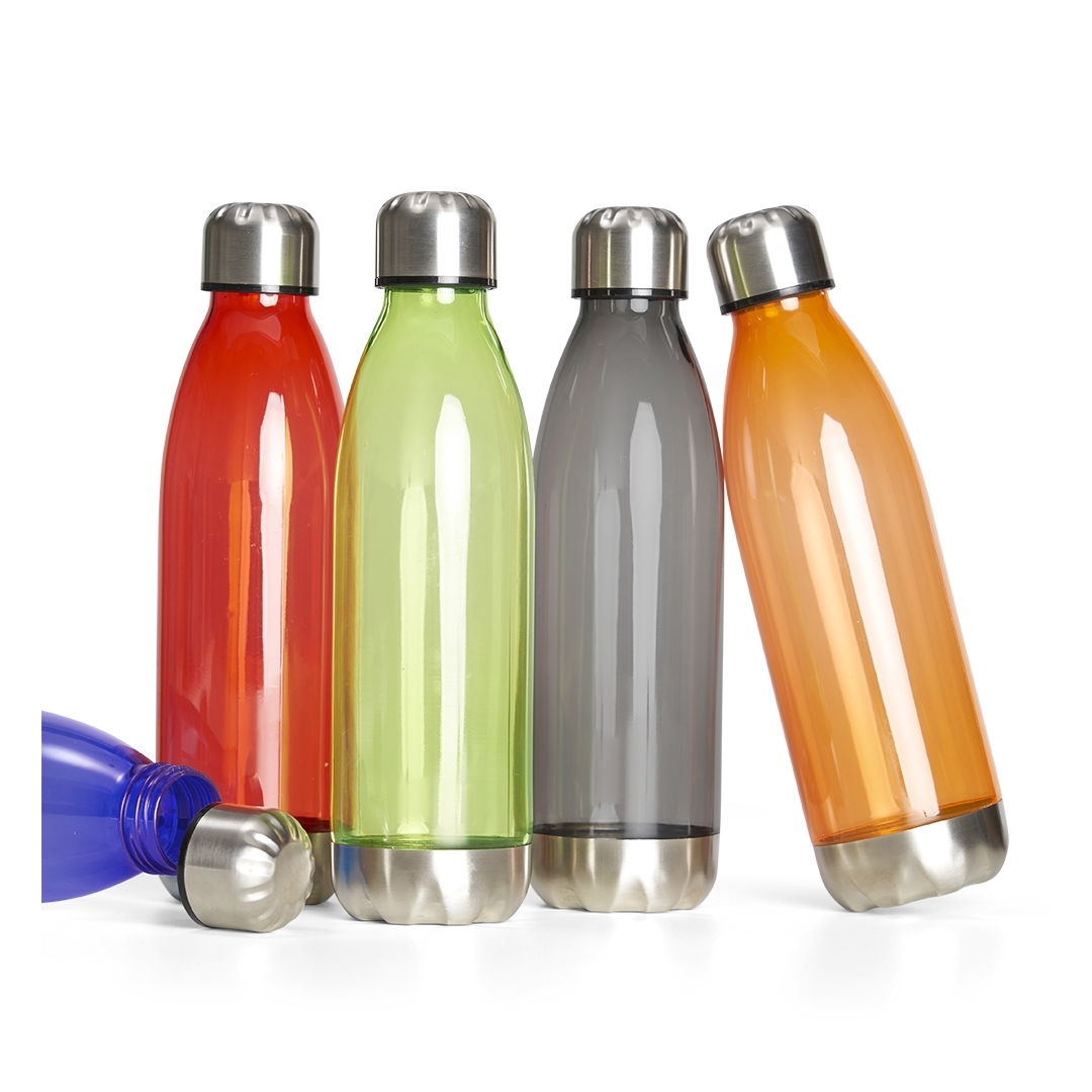 Garrafa plástica 700ml translúcida, possui tampa e base em alumínio Medidas aproximadas: 25 x 7cm. Personalização: silkscreen. Pedido mínimo: 50 unidades. -