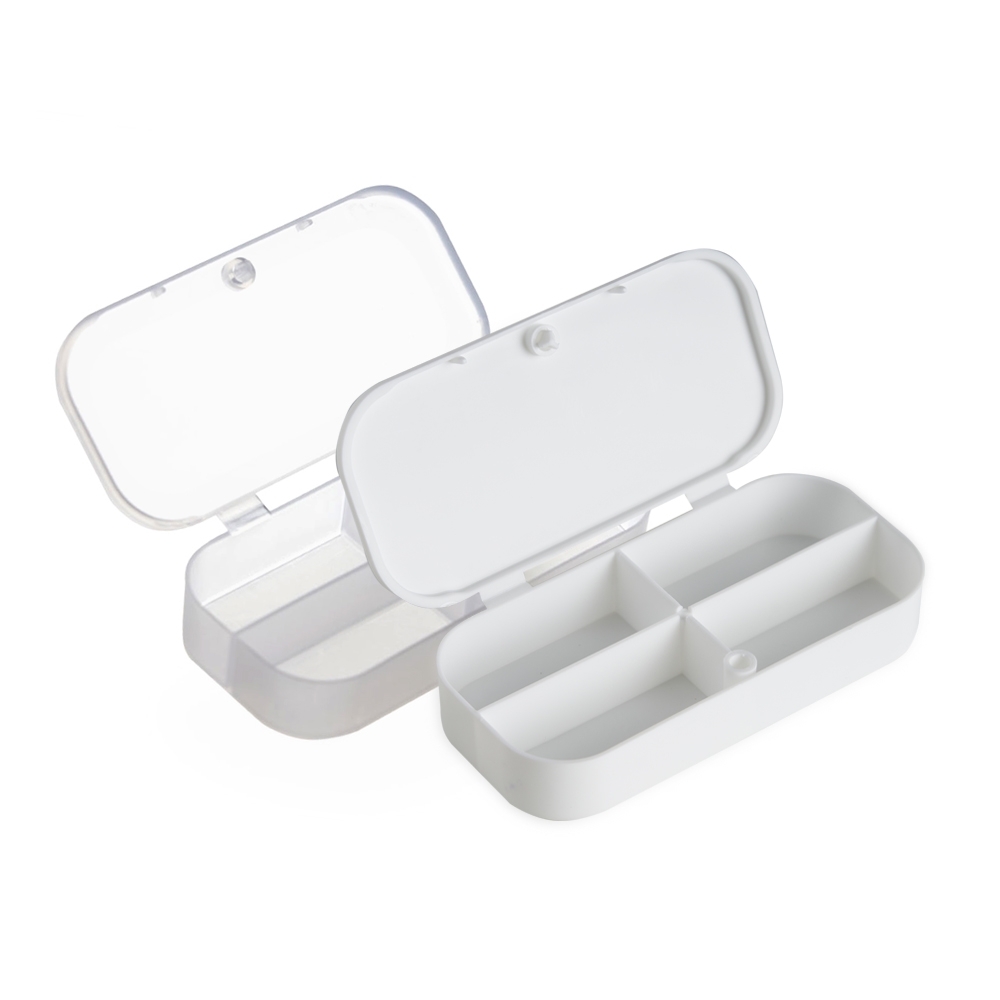 Porta comprimidos plástico com quatro divisórias. Medidas aproximadas: 4,5 cm x 9,2 cm x 2 cm. Pedido mínimo: 50 unidades. -