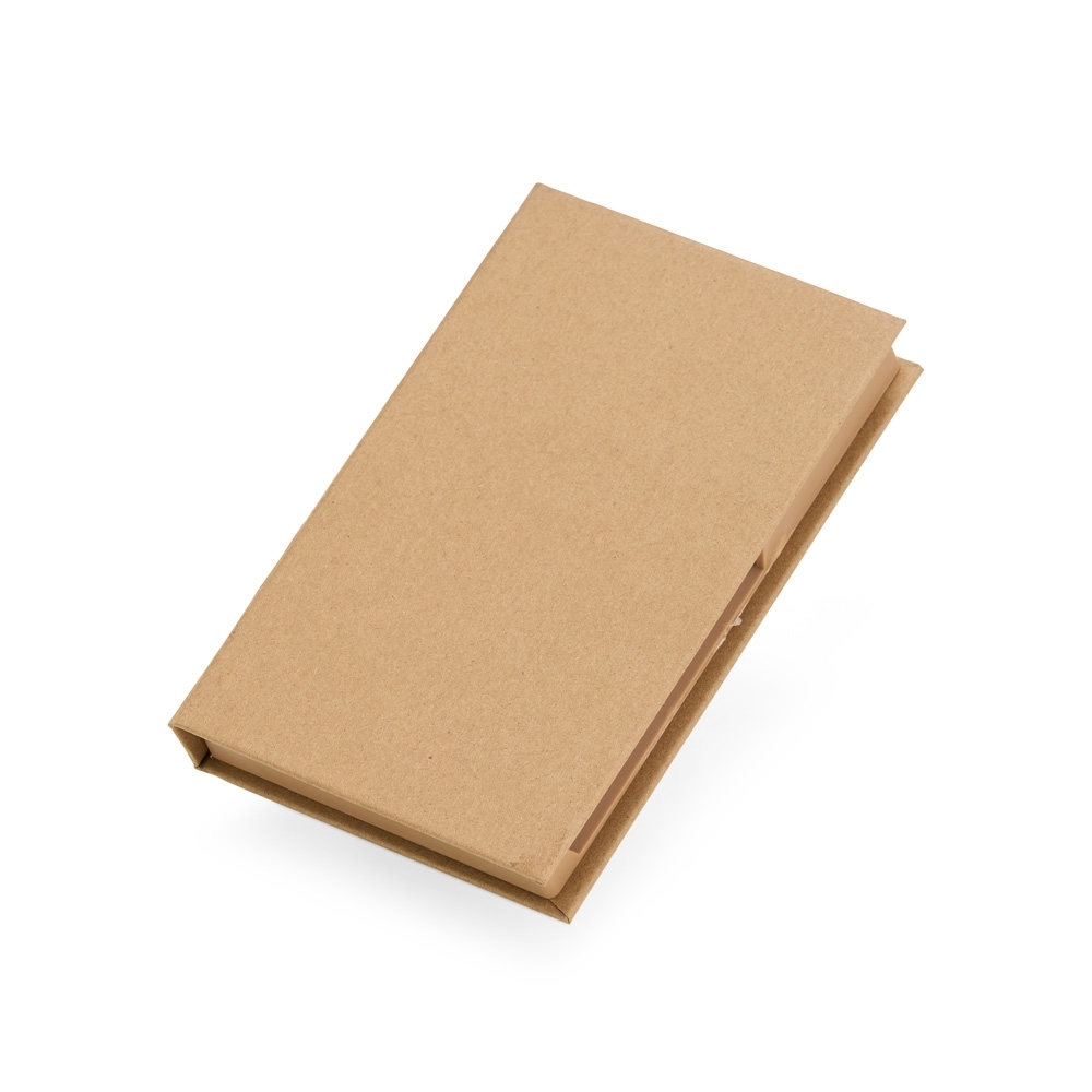 Feito de material kraft, ele vem com 100 folhas brancas para anotações, 5 marcadores autoadesivos coloridos, 7 clips guardados em uma gavetinha prática e uma mini caneta de papelão. E ainda conta com espaço para armazenar a caneta e dois suportes porta-caneta, garantindo praticidade no dia a dia. Medidas aproximadas: 10cm x 16cm. Pedido mínimo: 50 unidades.
