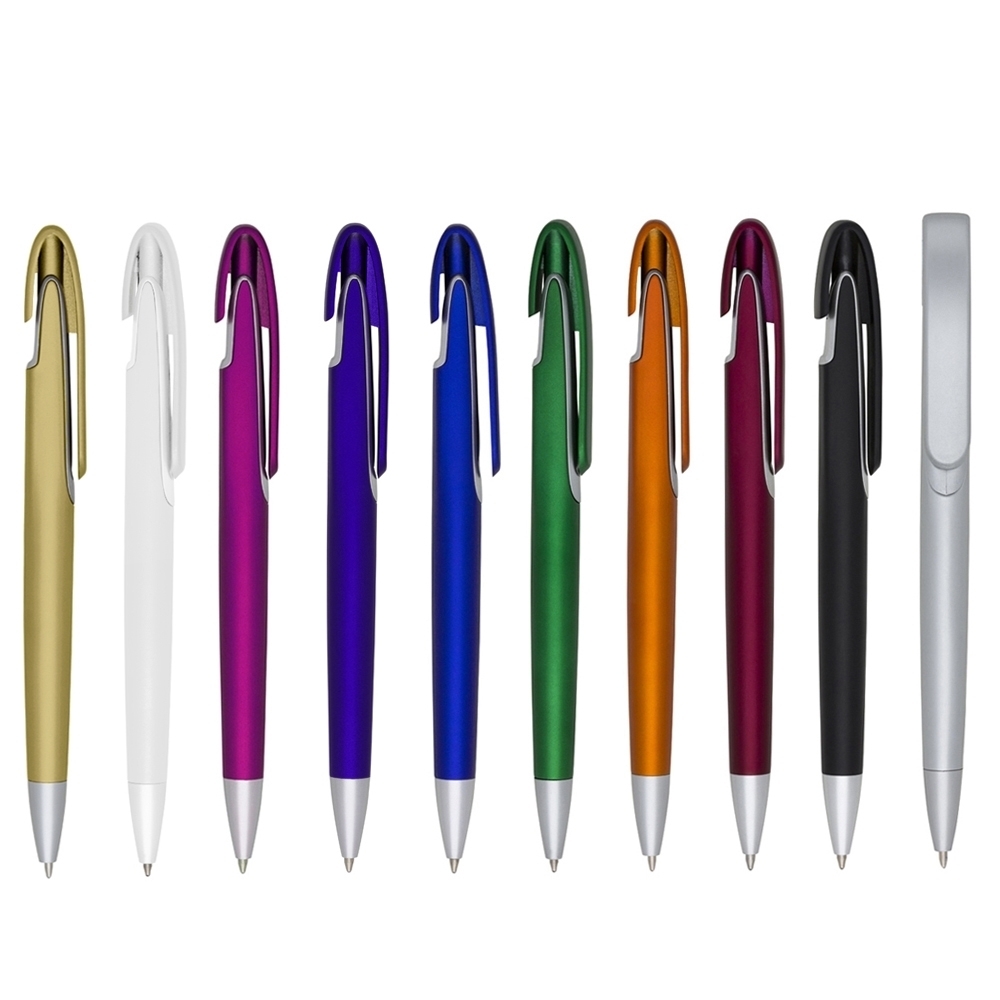 Caneta plástica fosca inteira colorida com detalhes prata. Clip de metal com doze furos, aciona por clique. Medidas aproximadas: 13,3 cm x 1,6 cm Personalização: silkscreen. Pedido mínimo: 300 unidades. -